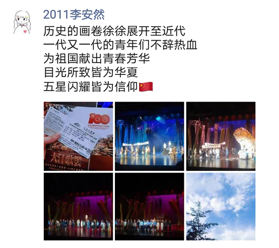 昨天跟随学院一起观看了话剧《大江歌罢》,感受颇深。我仿佛看到了当时的场景,它通过话剧将历史一幕幕还原,展示了当时民众对自己国家的热爱,他们用自己的信念以及革命热情推动着社会发展。我想说:我们要热爱祖国,要像当时的青年一样,为我们中华民族的伟大复兴贡献自己的一份力。我相信一定会实现中华民族伟大复兴!