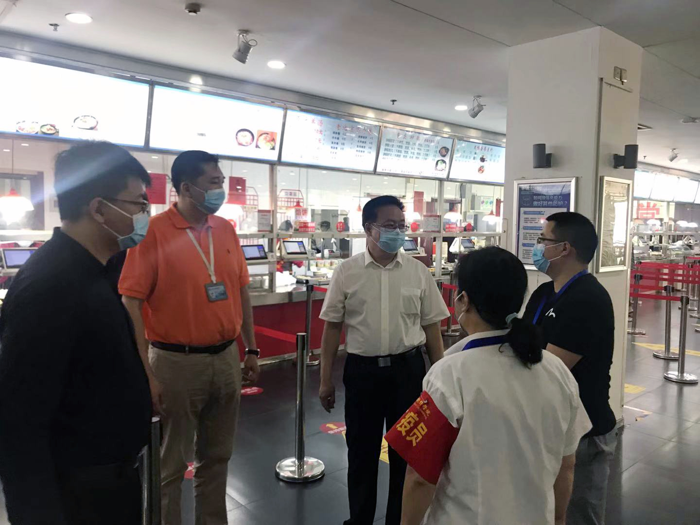 检查过程中,淡春江副处长走访了食堂各个点位,听取了学院食堂管理、人员管理等工作介绍,对学院安装遮阳棚、设置测温门、配备洗手池等防控设施给予了肯定。他强调,疫情期间做好食品安全工作尤为重要,要在原有的工作基础上,更加严格、更加仔细地严把食品安全关,确保师生舌尖上的安全。