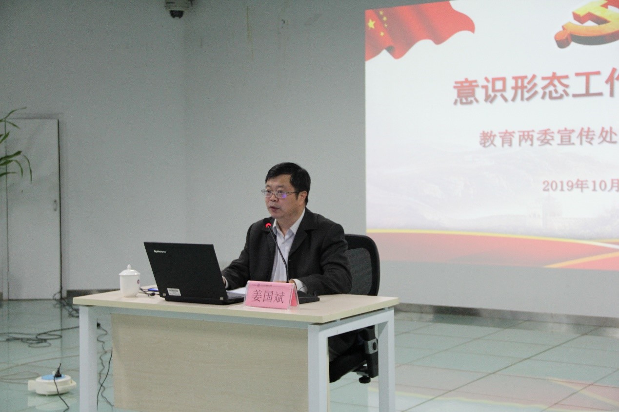 为进一步深入学习习近平总书记关于意识形态工作的重要讲话精神,贯彻落实中央、市委以及教育两委意识形态工作重要部署,提高意识形态工作能力和水平,10月31日,我院举行意识形态工作专题培训讲座,邀请市委教育工委、市教委宣传处处长姜国斌,就如何准确把握高校意识形态重点工作、用力方向等进行培训。党委书记刘十洲,党委委员、副院长刘石英,副院长高翔,党委委员、纪委书记李洋,党委委员、创业学院院长张建勇,纪委副书记潘晓棣及学院科级以上干部参加讲座。活动由副院长刘石英主持。