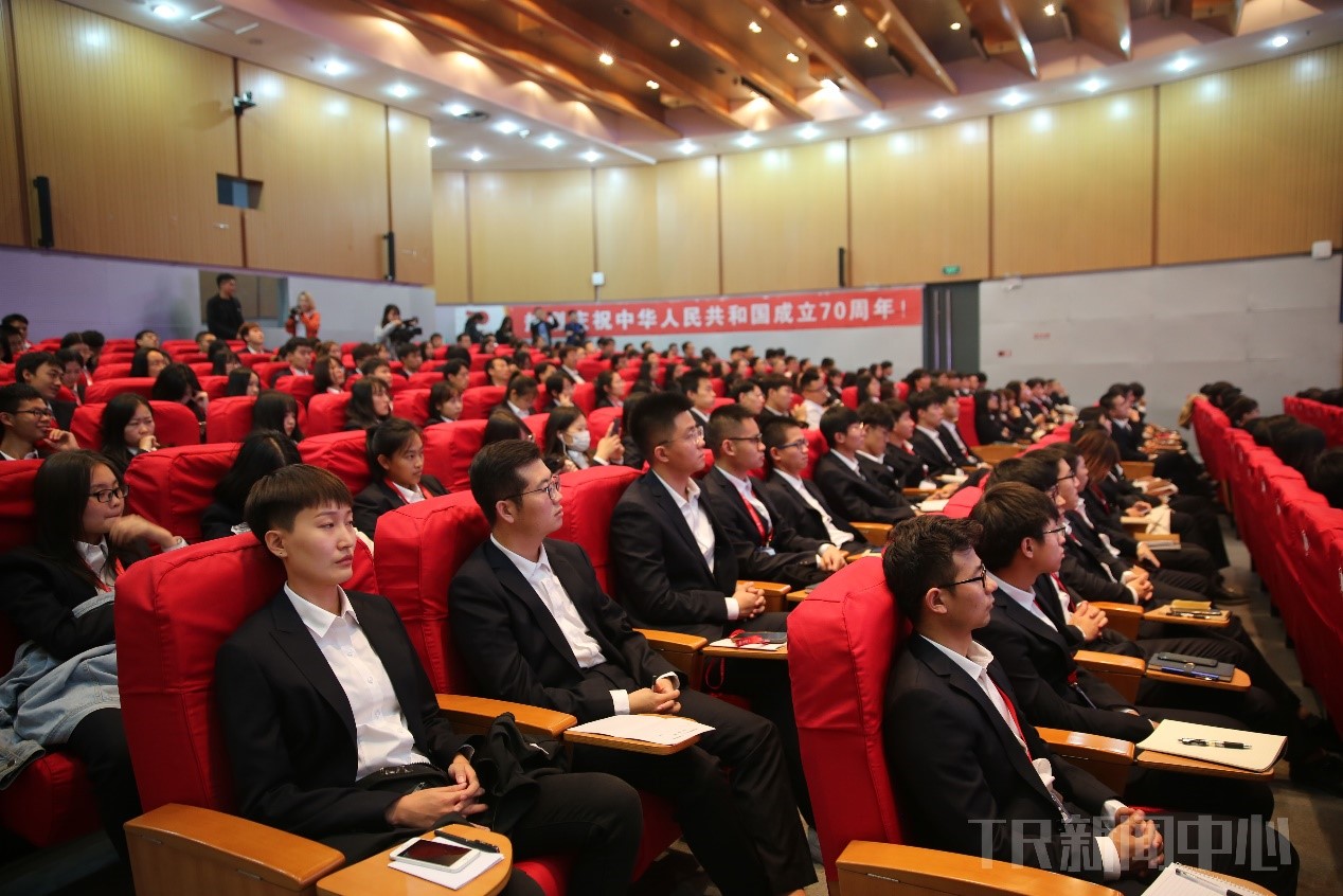 十洲书记首先与同学们共同观看了《开学第一课·五星红旗,我为你自豪》。节目以“国旗下的讲述”为内容主线,选取70年来五星红旗飘扬的重要场合和精彩瞬间,挖掘若干组具有时代厚重感、体现青春正能量的人物故事,邀请成果丰硕的科学家、德艺双馨的艺术家、事迹厚重的英雄模范人物、新时代的创新实践者、青少年杰出代表等进行了故事讲述,以点带面、以小见大地展现了新中国70年的发展变化,进一步激发了同学们对祖国深深的热爱之情。