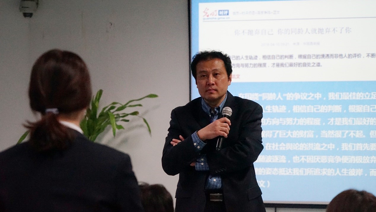 高翔副院长向第三期至诚班学员代表授旗。随后以“朗读者”的形式分享了他的成长、工作经历,并根据当前热点话题“你的同龄人正在抛弃你”及“创新创业”等同同学们展开了讨论。“在每个人的人生坐标系中,需要超越的从来都不是同向而行的同龄人,而是一个个标注成长的过往节点,是属于过去的自己。”高翔院长勉励大家,要认真过好每一天,不断提升自己的专业本领,在每一次成长的机会中锻造提升自己,建设祖国更美好的未来。