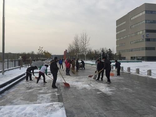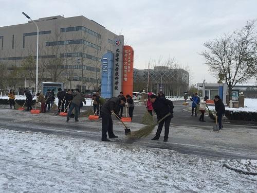 后勤与保卫部、学生事务部等部门迅速组织学生志愿者投入到其他路段的积雪清扫活动中。志愿活动倡议书刚一发布,学生们就积极响应,各教学区楼门前、学院各个主干道上,到处是一片热火朝天的劳动场面。截至中午,各路段积雪基本清扫完毕,为广大师生开辟出了一条条安全通道。