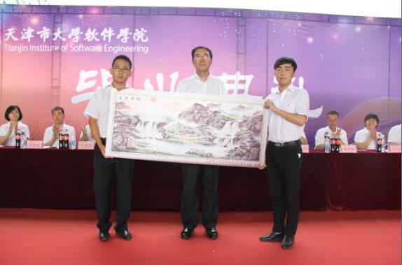 接着,学院党委书记刘十洲代表学院接受了2015届毕业生代表向母校赠送的纪念品——“蜀锦刺绣---旭日东升”,寓意着毕业生对母校事业发展昌盛、蒸蒸日上的美好祝愿,也预示着同学们在人生道路上会有一个新的开始,像初升的太阳逐渐绽放自己的光芒。