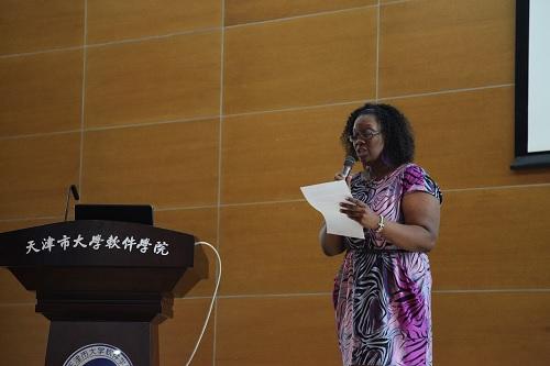 随后,美国教师Kristin女士作了主题发言,她充分肯定了学员们的学习态度,通过本次夏令营,我们的学生在提高英语技能的同时,从多方面了解了美国文化,在一定程度上适应了英语背景下的商务及IT工作环境。
