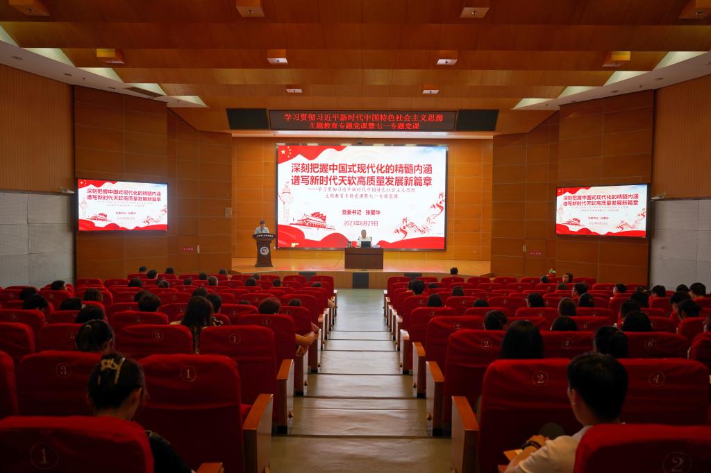 为迎接建党102周年,深入推进学习贯彻习近平新时代中国特色社会主义思想主题教育走深走实,进一步增强党员干部对中国式现代化的认识,以党建为引领推进学校高质量发展,6月29日,党委书记张爱华以“深刻把握中国式现代化的精髓内涵,谱写新时代天软高质量发展新篇章”为主题讲授主题教育专题党课暨七一专题党课。在校领导班子成员、全体教职工党员、协同育人企业(临时)党支部党员代表、学生党员代表和入党积极分子共同参加学习。