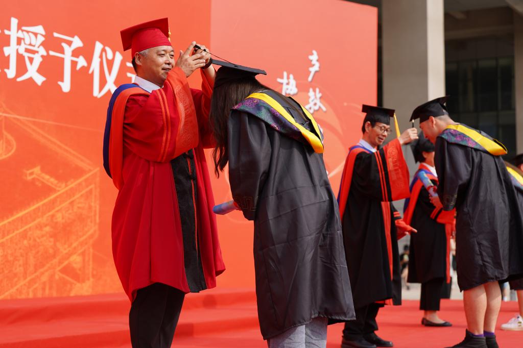 在学位授予仪式上,我校及合作高校校领导一一为来到现场的2023届毕业生拨正流苏授予学位,全体师生共同见证了同学们圆满完成学业、获得学位的人生重要时刻。
