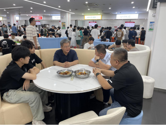 爱华书记等领导与22级学生白雨鑫、23级学生马钊同桌就餐。进餐过程中,院领导详细询问了同学们的学习、生活、用餐情况,并介绍了天软“一站式”学生社区的建设进度和未来功能规划。同学们表示:学院的环境和配套服务功能改善很大,食堂经过全面整修提升后,焕然一新,菜品可口,而且性价比很高;“一站式”学生社区建设极大方便了学生的学习生活,非常感谢学院提供了良好的学习、生活环境。