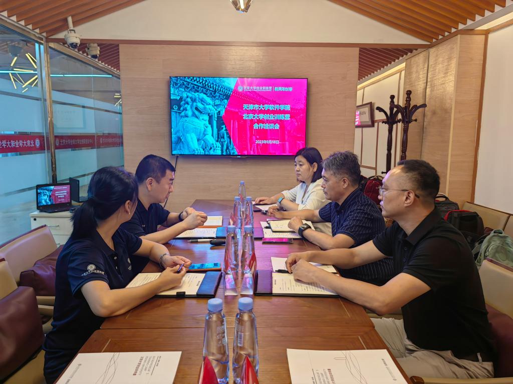 双方分别介绍了近年来各自在双创企业孵化、项目服务、课程训练等方面取得的成果,并重点讨论了关于“天开杯”创聚津门全国大学生智能科技创新创业挑战赛的合作事宜。张玉波校长指出,天津市大学软件学院多年来在大学生创新创业教育与项目培育方面积累了丰富的经验,此次作为“挑战赛”的承办单位,将全力协助市教育两委及市科技局做好赛事的组织工作,与北创营的深入合作将为大赛的成功举办奠定良好基础。袁航总经理表示,北创营依托北大教育资源与校友资源帮助广大创业者持续成长,一直以来也服务了众多天津科创企业,此次将与天软加强合作,在项目推荐、项目训练、赛事组织等方面为“挑战赛”做好赛事支持。
