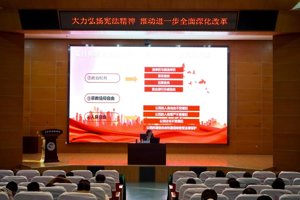 为深入学习贯彻党的二十届三中全会精神和全国教育大会精神,加强宪法法治教育,进一步全面推进教育强国建设,2024年12月4日下午,我校邀请天津四方君汇律师事务所李嵘律师作题为“大力弘扬宪法精神 推动进一步全面深化改革”的专题讲座。全体教职员工、协同育人企业代表及学生代表参加,讲座由办公室负责同志主持。