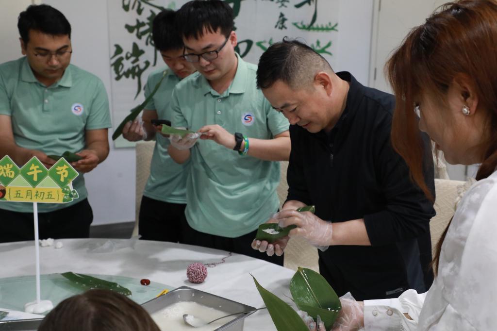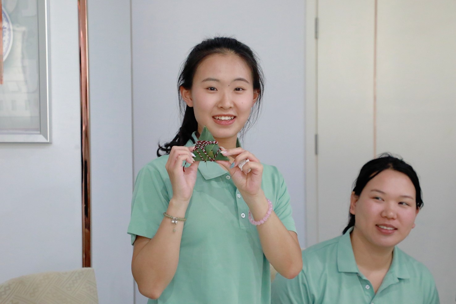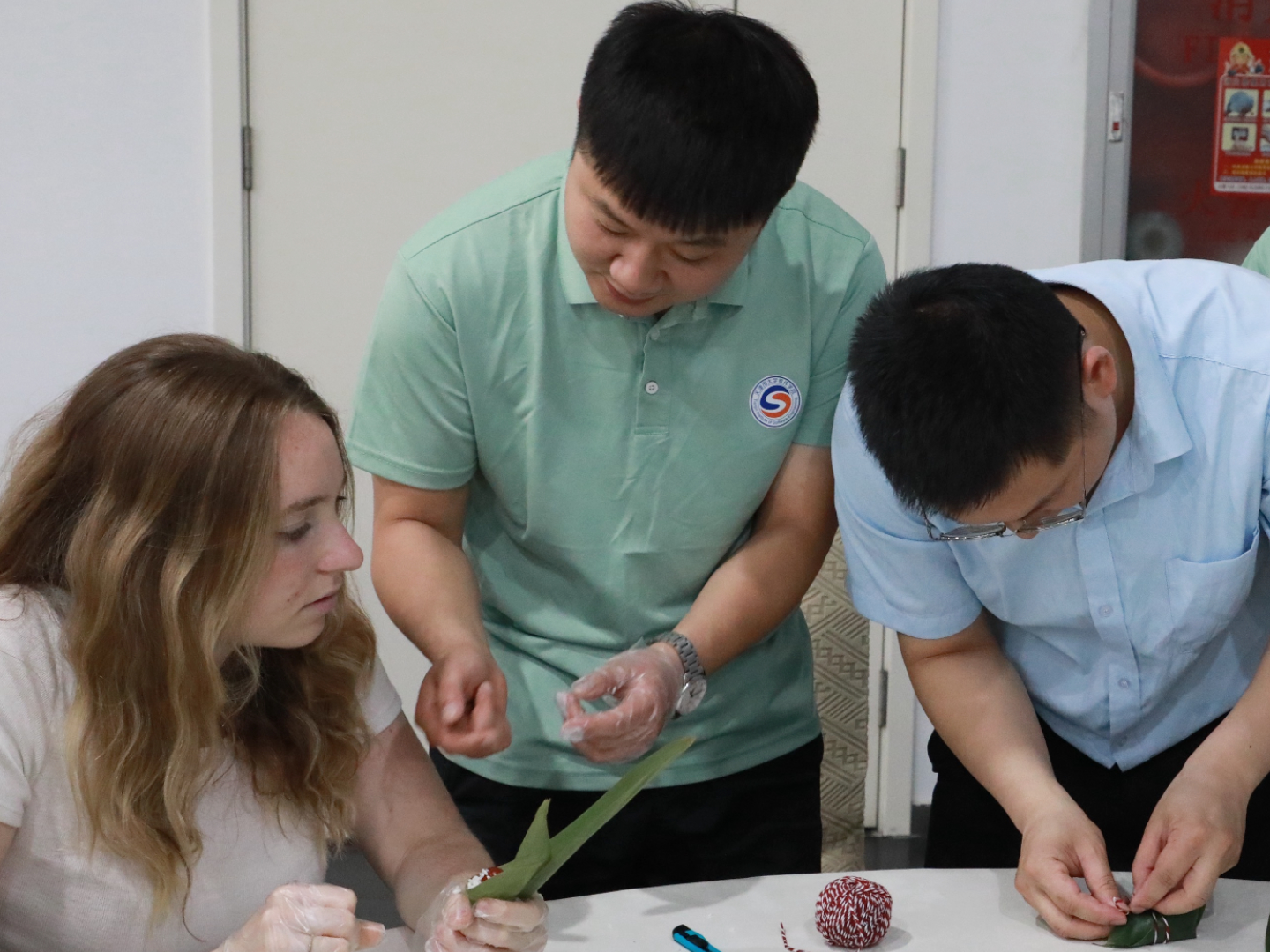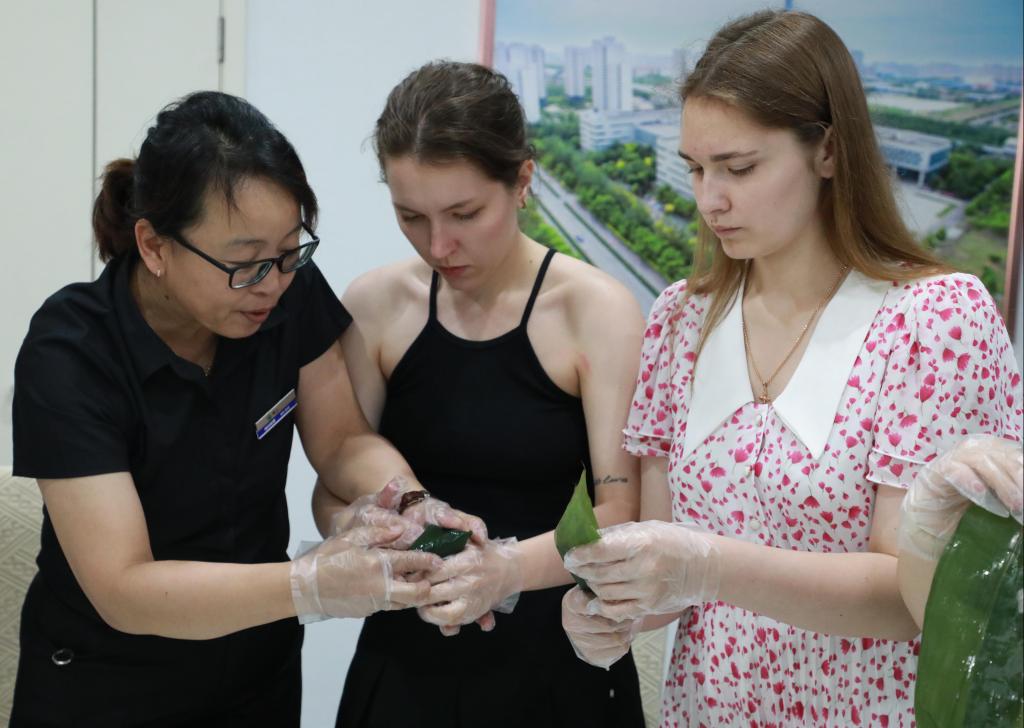 在“粽艺比拼”环节,师生围坐,大家分工协作,折粽叶、填糯米、捆粽绳……现场欢声笑语不断。留学生们饶有兴致地学习包粽子,尽管手法略显生疏,但在周围同学的帮助下,逐渐掌握了技巧。合作诞生的粽子,成为文化跨越国界、连接校际师生情感的纽带。大家在亲手体验中感受中国端午节日氛围,沉浸式了解中国传统文化。