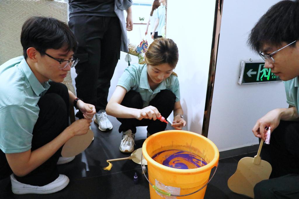 此次活动不仅有师生齐上手,食堂工作人员与物业人员也参与其中,形成育人合力,共同体验包粽子的乐趣,感受劳动之美。而随后的“漆扇雅作”活动,大家以漆为笔,以扇为纸,将团扇放入水中,以点、甩、弹、划等手法,在水面绘出图案效果,晕染在扇面,形成了彩色图案。