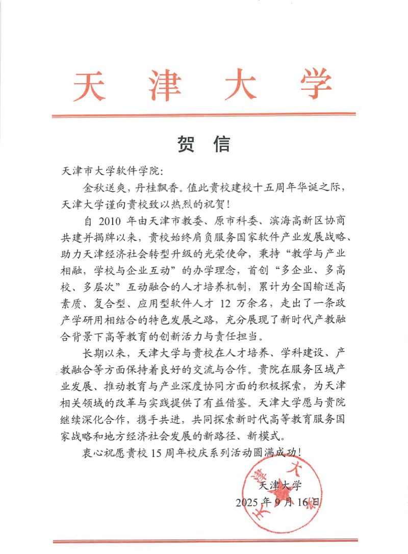 校庆期间,学校收到了兄弟院校、合作办学高校、行业协会等发来的贺信祝福,表达对天软发展成就的祝贺和未来发展的美好期许。