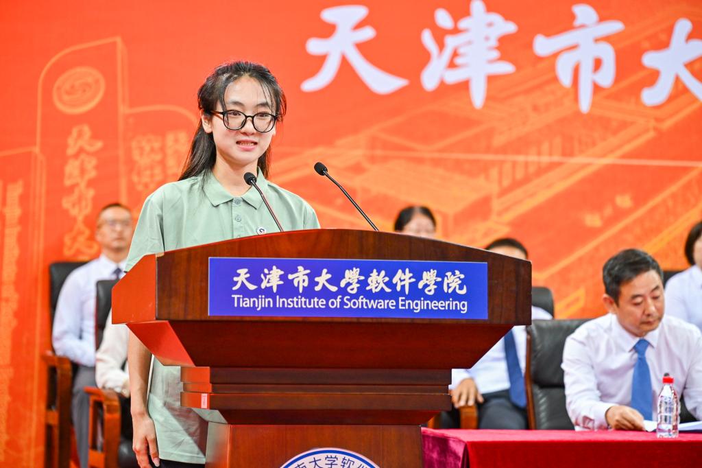 新生代表门心悦同学发言。她号召全体新生,作为未来软件强国的接力者、软件报国的践行者,让个人的“小目标”融入国家发展的“大蓝图”。以智创无限,慧联未来的奋进姿态,肩负起时代赋予的责任。