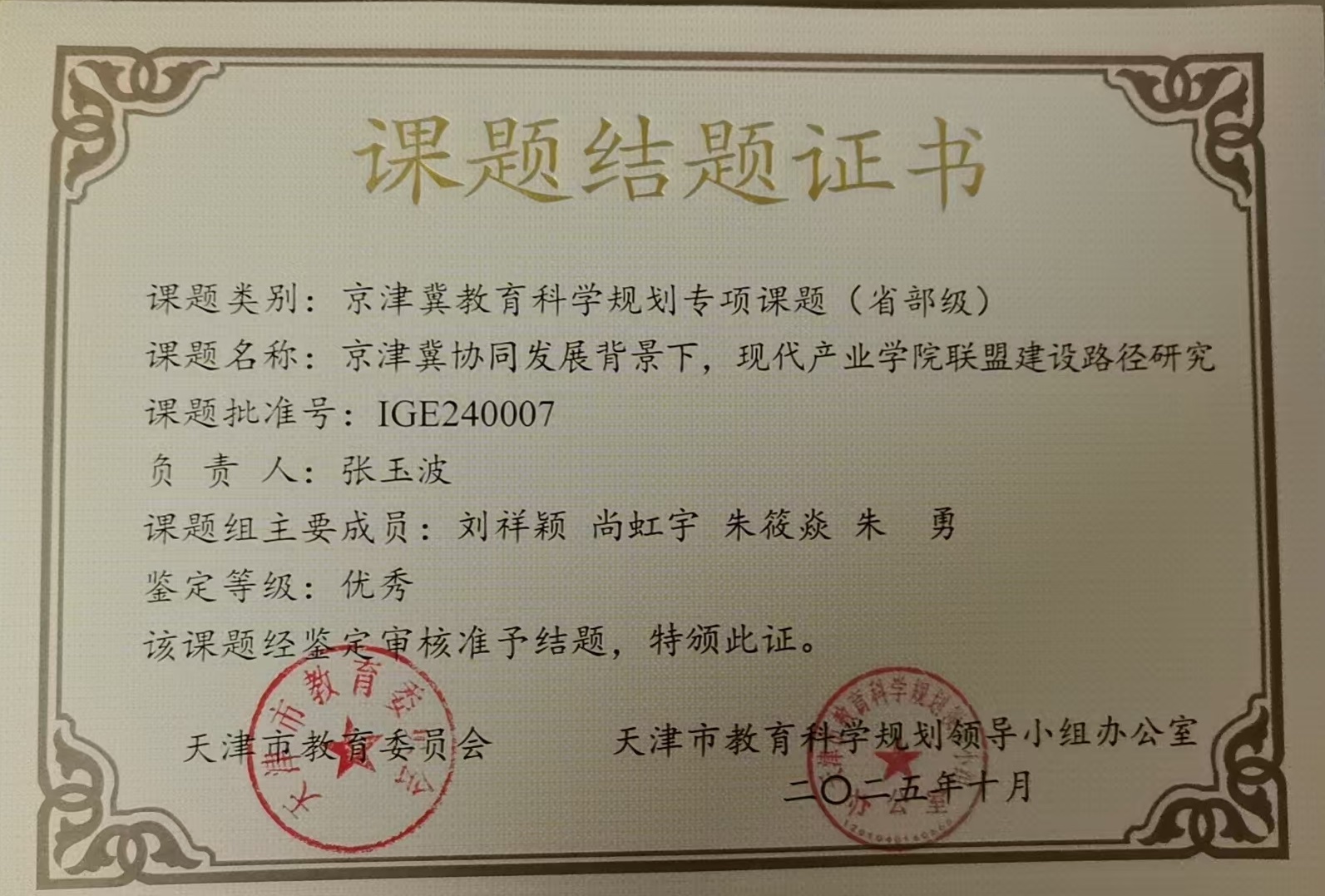 近日,由天津市教育委员会组织的京津冀教育科学规划专项课题结项评审结果正式发布。我校申报的课题《京津冀协同发展背景下,现代产业学院联盟建设路径研究》(课题批准号:IGE240007)顺利通过结项验收,并获评优秀,标志着我校在京津冀教育协同发展领域取得突破。