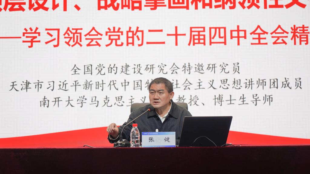 11月18日下午,全国党的建设研究会特邀研究员、天津市习近平新时代中国特色社会主义思想讲师团成员、南开大学马克思主义学院张健教授,应邀作了题为《指导“十五五”时期经济社会高质量发展的顶层设计、战略擘画和纲领性文件——学习领会党的二十届四中全会精神》专题讲座。张健重点围绕深刻领会党的二十届四中全会的重要意义,准确把握“十五五”时期在中国式现代化进程中承上启下的重要地位,深刻领会“十五五”时期经济社会发展的指导方针和主要目标、战略任务和重大举措,坚持和加强党的全面领导等方面做了阐述,并对持续加强作风建设,推进作风建设常态长效,确保“十五五”擘画的宏伟蓝图源源不断转化为扎扎实实的工作成效做了强调。