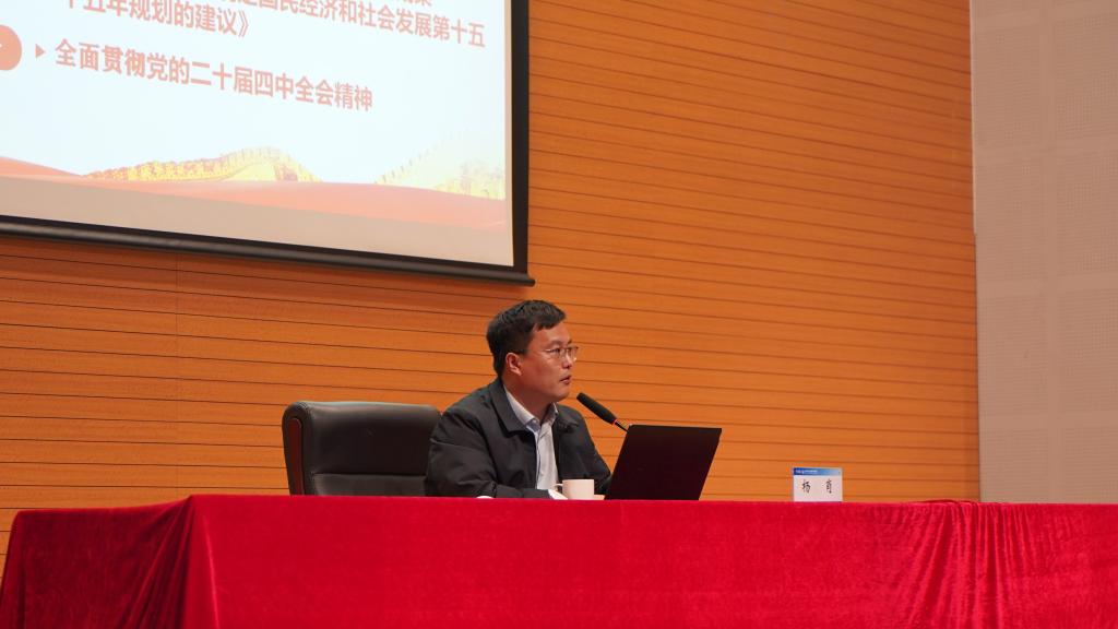 11月27日下午,我校邀请市委党校中共党史教研部副主任杨肖副教授对《中共中央关于制定国民经济和社会发展第十五个五年规划的建议》进行解读。结合总结“十四五”发展取得的重大成就,杨肖对“十五五”时期经济社会发展的总体思路、确立的指导思想、重要原则、主要目标、战略任务和重大举措等方面做了详细介绍。他指出,《建议》准确把握了我国发展所处的历史方位,在全面总结“十四五”时期重大成就的基础上,对“十五五”时期发展作出了系统全面的谋划,为我国未来五年发展指明了方向。