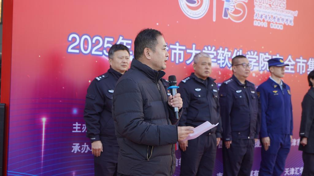 开幕式上,主持人详细介绍了活动整体规划与核心意义。天津市大学软件学院党委副书记张建勇在致辞中强调,安全是校园发展的基石,是学生成长的保障,希望通过本次市集让安全意识深植每一位师生心中。天津市公安局西青分局学苑派出所刘沙副所长代表公安机关表达了对校园安全建设的坚定支持,对同学们安全、健康成长的诚挚祝福,并结合校园案例,为师生普及了日常防护的关键。学生代表的发言则传递出同学们学习安全知识、参与校园安全建设的积极意愿。