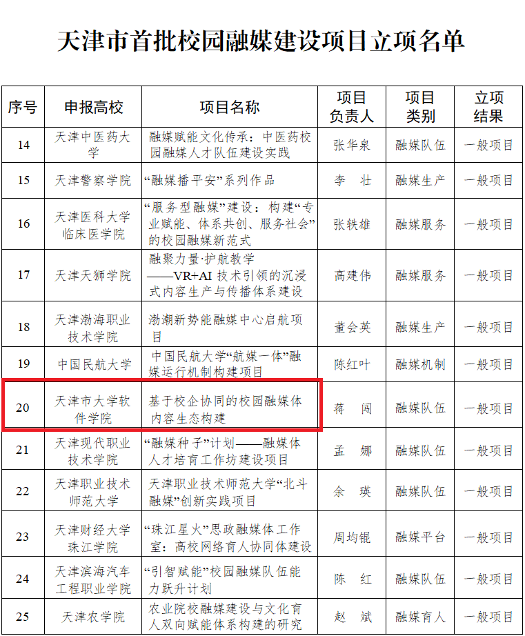 12月18日,市教育两委公布天津市首批校园融媒建设项目立项名单。在各高校积极申报基础上,经专家评审,最终确定11个项目为重点项目、14 个项目为一般项目。我校申报的《基于校企协同的校园融媒体内容生态构建》获一般项目立项。