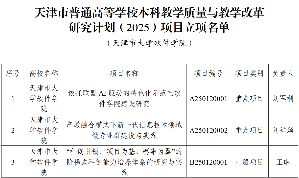 一直以来,我校坚守“教学与产业相融、学校与企业互动”的办学理念,深耕教育教学改革的重要成果。本次项目获批,体现了学校在特色化软件人才培养、产教深度融合、创新创业教育等领域的阶段性突破。获批项目紧密围绕信创产业人才培养、特软联盟资源共建、微专业体系优化等核心方向,与学校牵头的天津市特色化示范性软件学院协同发展联盟建设、京津冀软件人才培养基地建设高度契合,为我校“十五五”期间赋能区域经济发展进一步筑牢了教学改革根基。