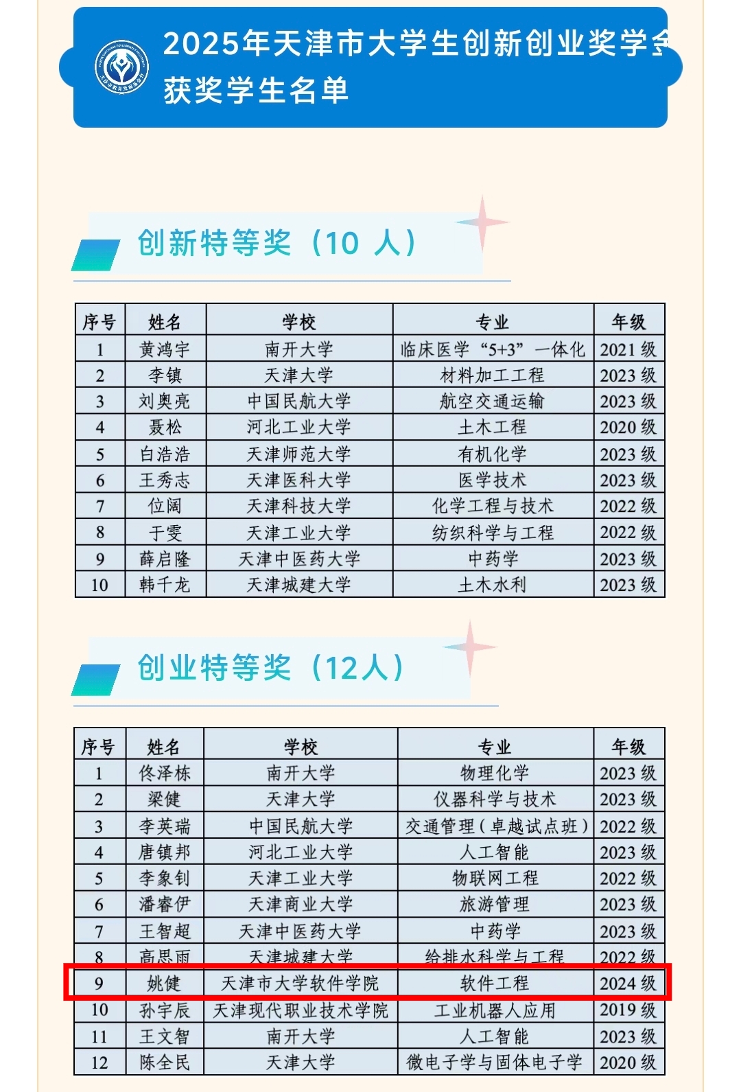 近日,2025年天津市大学生创新创业特等奖学金评选结果公布,我校24级退役大学生士兵姚健凭借出色的创业实践与项目成果,斩获创业赛道特等奖。