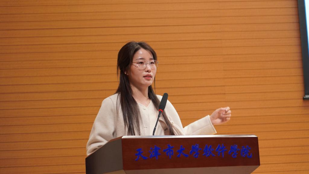 第一期学员代表韩诗音同学发言。她分享了在思政学习、实践锻炼、就业指导中的收获与感悟,讲述了从迷茫到坚定、从青涩到成熟的成长历程。她呼吁第二期学员坚守初心、珍惜平台、互助共进,以奋斗姿态续写“卓异”新篇章。