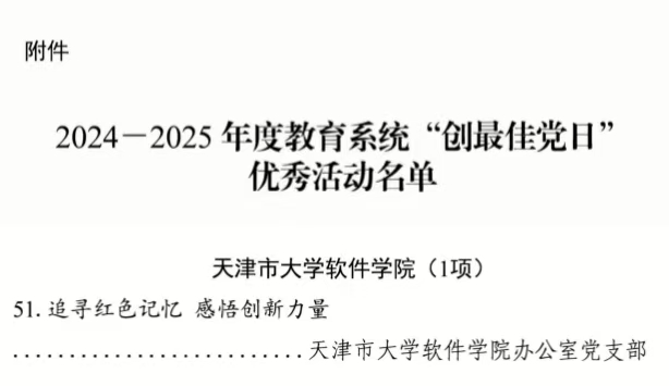 4月13日,中共天津市委教育工作委员会公布了2024-2025年度教育系统“创最佳党日”优秀活动评审结果,我校办公室党支部“追寻红色记忆 感悟创新力量 ”主题党日活动成功入选。