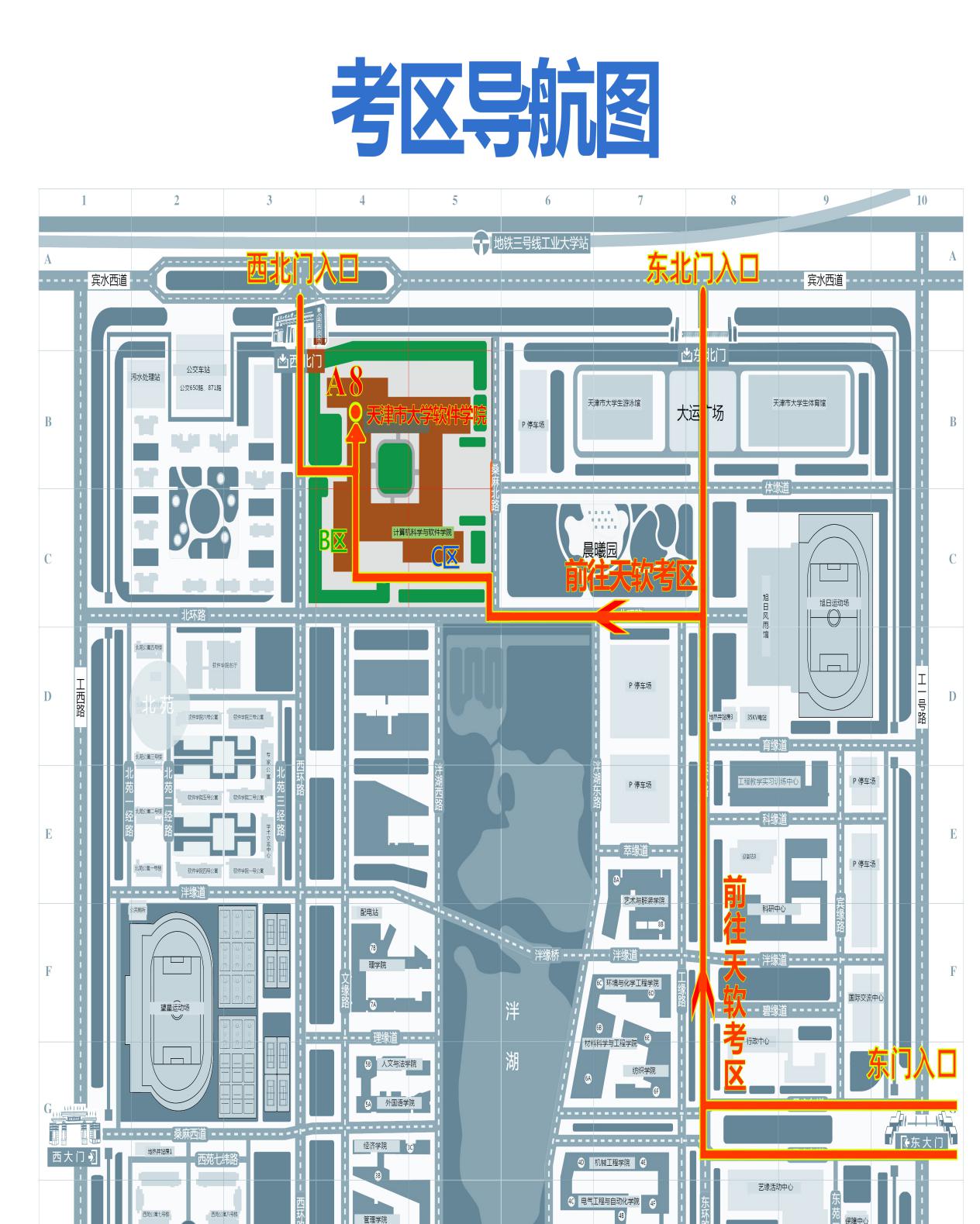 5.参加本次考试的考生可从天津工业大学西北门、东北门或东门凭准考证及二代居民身份证通过校验后,按指示牌指示步行到天津市大学软件学院(天软考区),考生车辆不允许进入学校,请考生提前熟悉考点路线,选择合理出行方式。