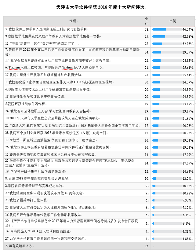 经过全院师生的积极参与,在29条具有标志性的候选新闻中进行票选,最终确定出“天津市大学软件学院2018年度十大新闻”。现将具体评选结果及获奖情况公布如下: