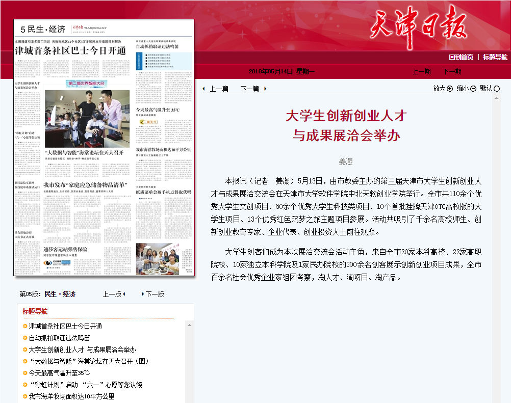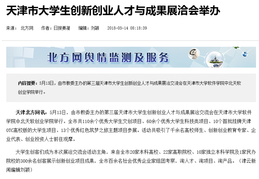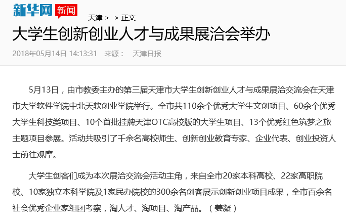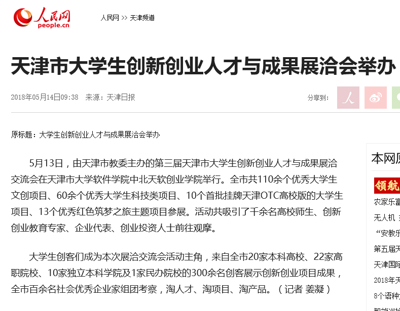 5月13日上午,第三届天津市大学生创新创业人才与成果展洽交流会在我院创业学院举行,本次活动由天津市教育委员会主办,天津市高校众创空间联盟和我院承办。全市共110余个优秀大学生文创项目、60余个优秀大学生科技类项目、10个首批挂牌天津OTC高校版的大学生项目、13个优秀红色筑梦之旅主题项目参展。天津电视台、天津广播电台、天津日报等多家媒体对活动进行了报道,人民日报、新华网等对活动有关报道进行了转载。现将有关内容摘编如下: