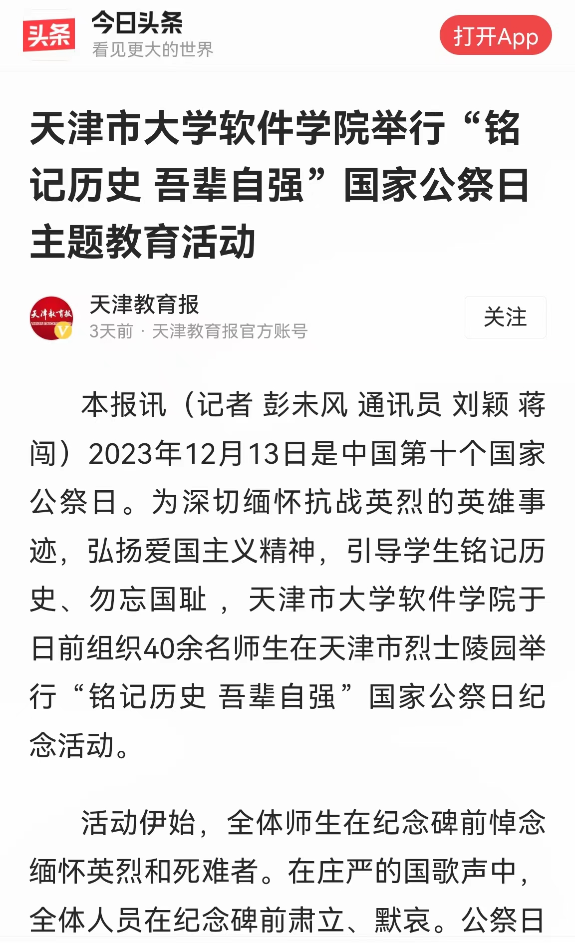 2023年12月14日,天津教育报官方头条号以《天津市大学软件学院举行“铭记历史 吾辈自强”国家公祭日主题教育活动》为题对我校进行了报道。