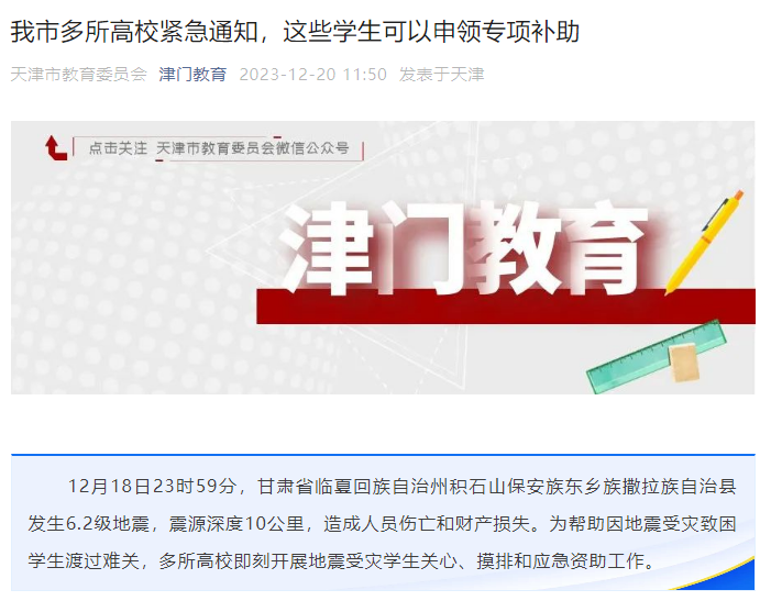 12月18日23时59分,甘肃省临夏回族自治州积石山保安族东乡族撒拉族自治县发生6.2级地震,震源深度10公里,造成人员伤亡和财产损失。为帮助因地震受灾致困学生渡过难关,多所高校即刻开展地震受灾学生关心、摸排和应急资助工作。