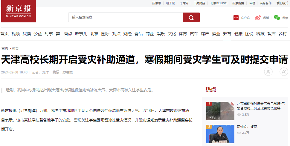 2024年2月8日,新京报官网以《天津高校长期开启受灾补助通道,寒假期间受灾学生可及时提交申请》为题对我校进行了报道。