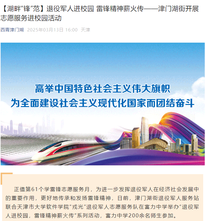 2025年3月13日,天津市西青区人民政府津门湖街道办事处官方微信公众号“西青津门湖”以《退役军人进校园 雷锋精神薪火传——津门湖街开展志愿服务进校园活动》为题对我校进行了报道。