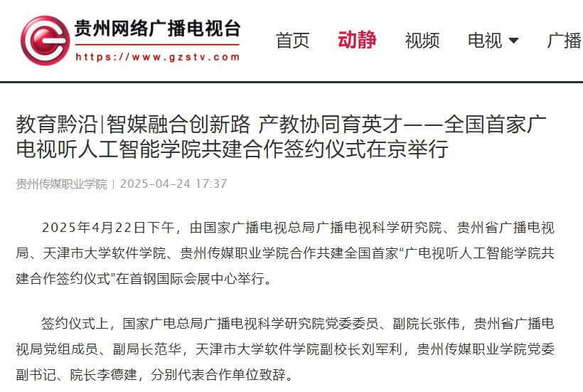 2025年4月24日,贵州网络广播电视台官网以《智媒融合创新路 产教协同育英才——全国首家广电视听人工智能学院共建合作签约仪式在京举行》为题对我校进行了报道。