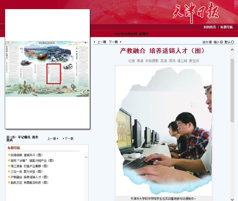 2025年8月31日,天津日报13版以《产教融合 培养适销人才(图)》为题对我校进行了报道。