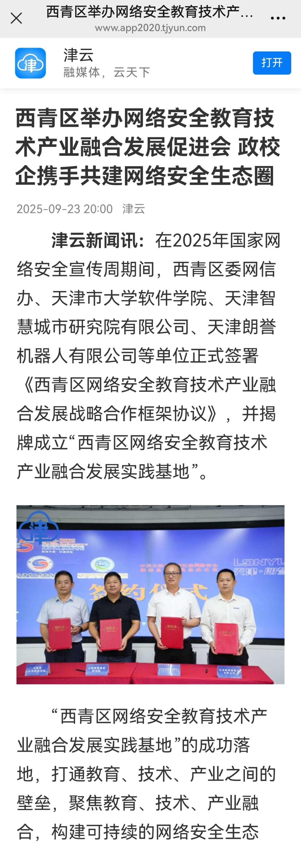 2025年9月23日,津云以《西青区举办网络安全教育技术产业融合发展促进会 政校企携手共建网络安全生态圈》为题对我校进行了报道。