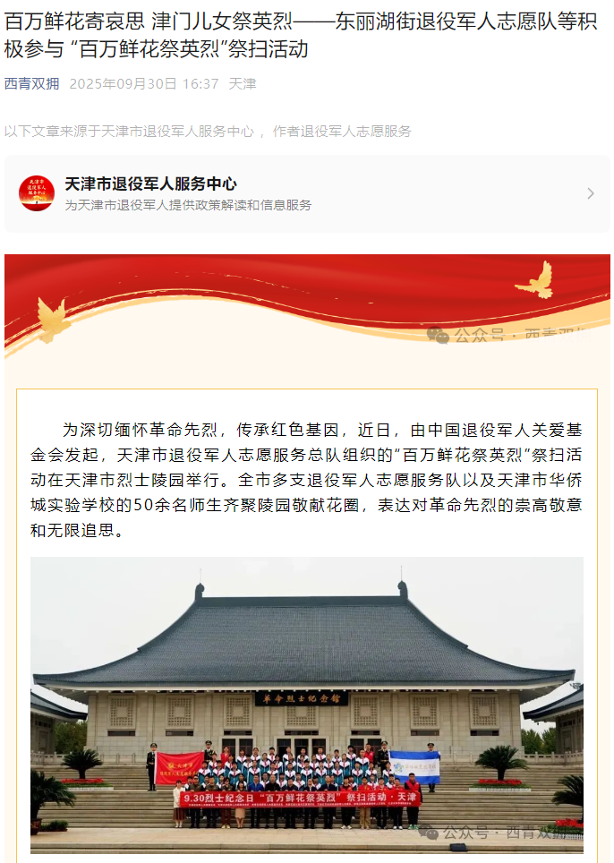 2025年9月30日,天津市西青区退役军人事务局官方微信公众号“西青双拥”以《百万鲜花寄哀思 津门儿女祭英烈——东丽湖街退役军人志愿队等积极参与 “百万鲜花祭英烈”祭扫活动》为题对我校进行了报道。
