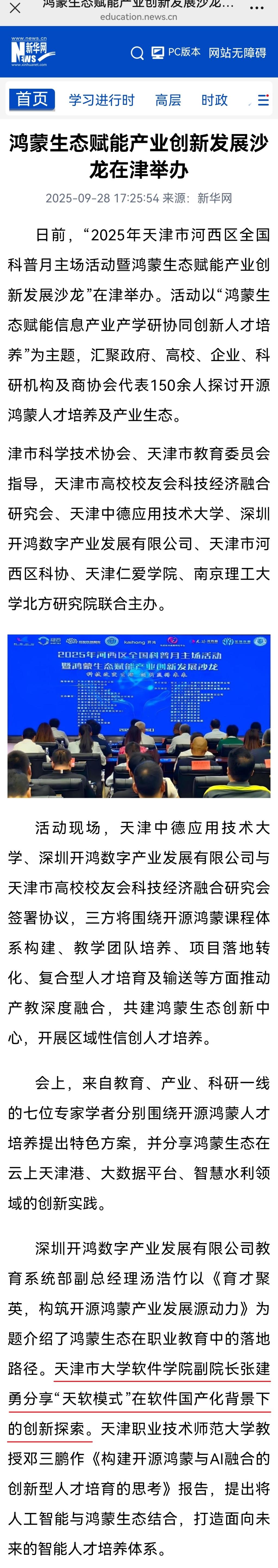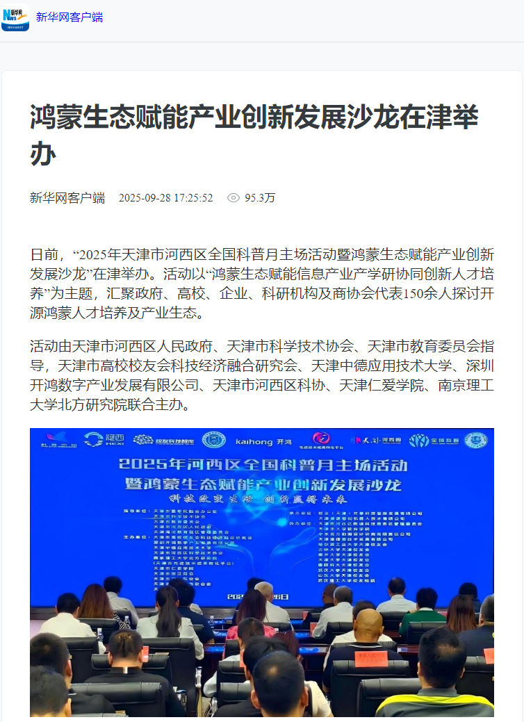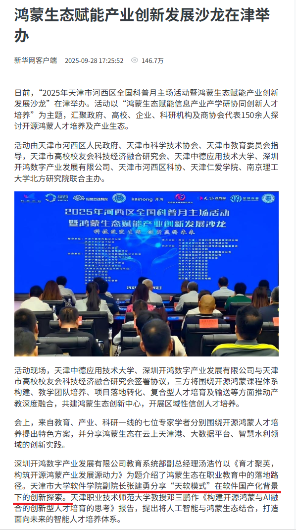 2025年9月28日,我校党委副书记张建勇受邀参加2025年天津市河西区全国科普月主场活动暨鸿蒙生态赋能产业创新发展沙龙,并作报告。新华网客户端以《鸿蒙生态赋能产业创新发展沙龙在津举办》为题进行了报道。