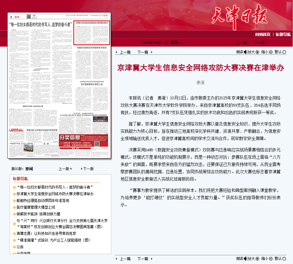 2025年10月13日,天津日报02版以《京津冀大学生信息安全网络攻防大赛决赛在津举办》为题对我校进行了报道。