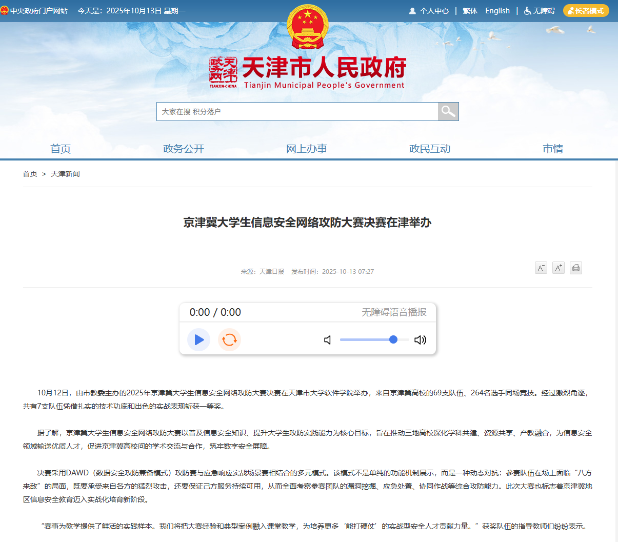 2025年10月13日,天津市人民政府官网以《京津冀大学生信息安全网络攻防大赛决赛在津举办》为题对我校进行了报道。