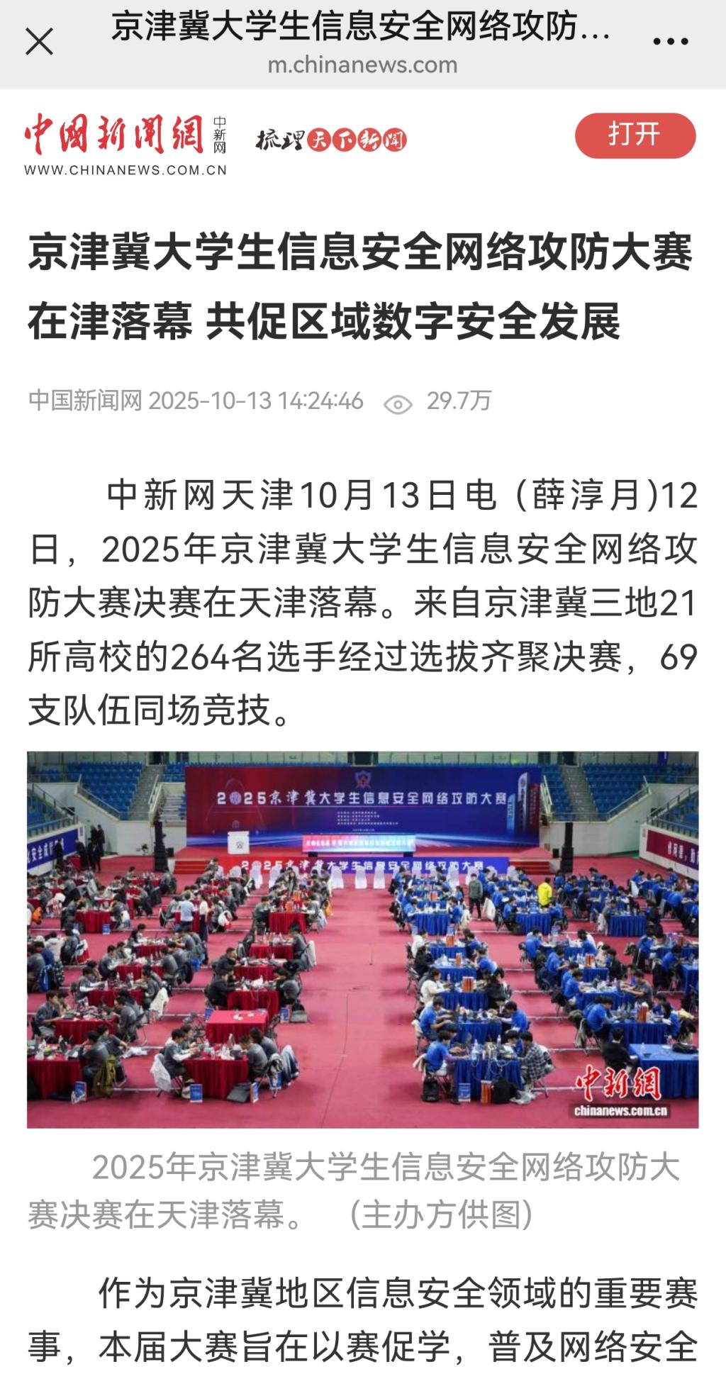 10月12日,由天津市教委主办、天津市大学软件学院承办的2025年京津冀大学生信息安全网络攻防大赛决赛圆满落下帷幕。中国新闻网以《京津冀大学生信息安全网络攻防大赛在津落幕 共促区域数字安全发展》为题进行了报道。