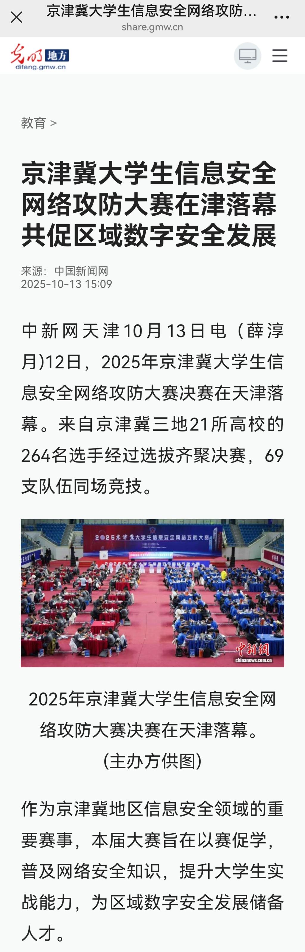 10月12日,由天津市教委主办、天津市大学软件学院承办的2025年京津冀大学生信息安全网络攻防大赛决赛圆满落下帷幕。光明网以《京津冀大学生信息安全网络攻防大赛在津落幕 共促区域数字安全发展》为题进行了报道。