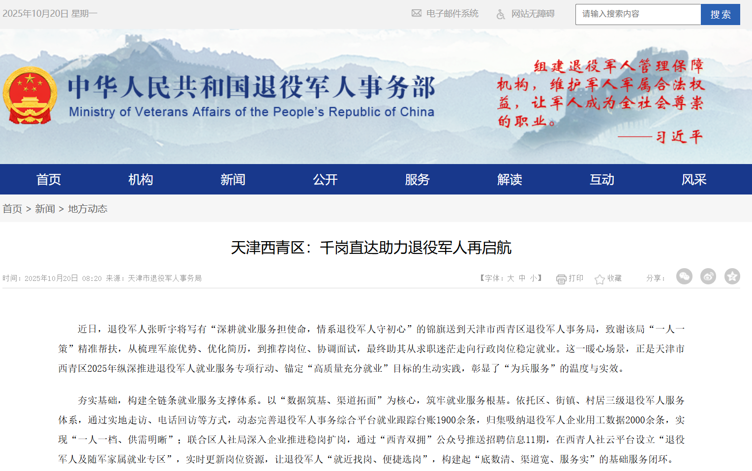 2025年10月20日,中华人民共和国退役军人事务部官网以《天津西青区:千岗直达助力退役军人再启航》为题进行了报道。