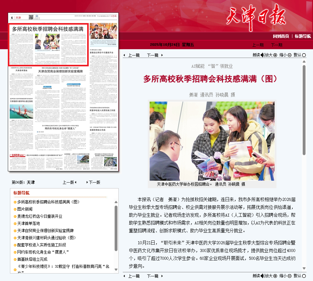 2025年10月24日,天津日报06版以《多所高校秋季招聘会科技感满满》为题对我校进行了报道。