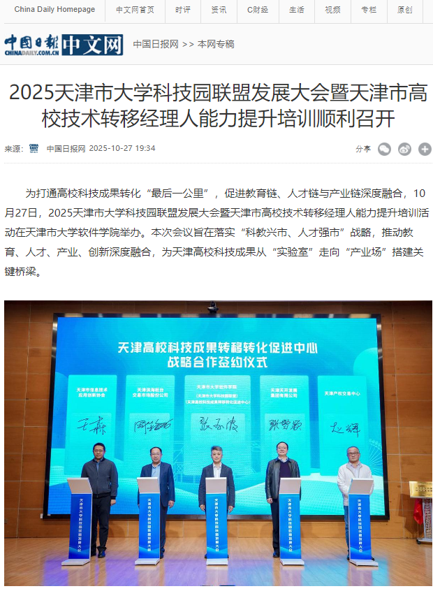 2025年10月27日,中国日报网以《2025天津市大学科技园联盟发展大会暨天津市高校技术转移经理人能力提升培训顺利召开》为题对我校进行了报道。