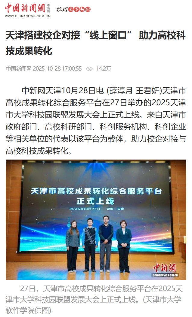 2025年10月28日,中国新闻网以《天津搭建校企对接“线上窗口” 助力高校科技成果转化》为题对我校进行了报道。