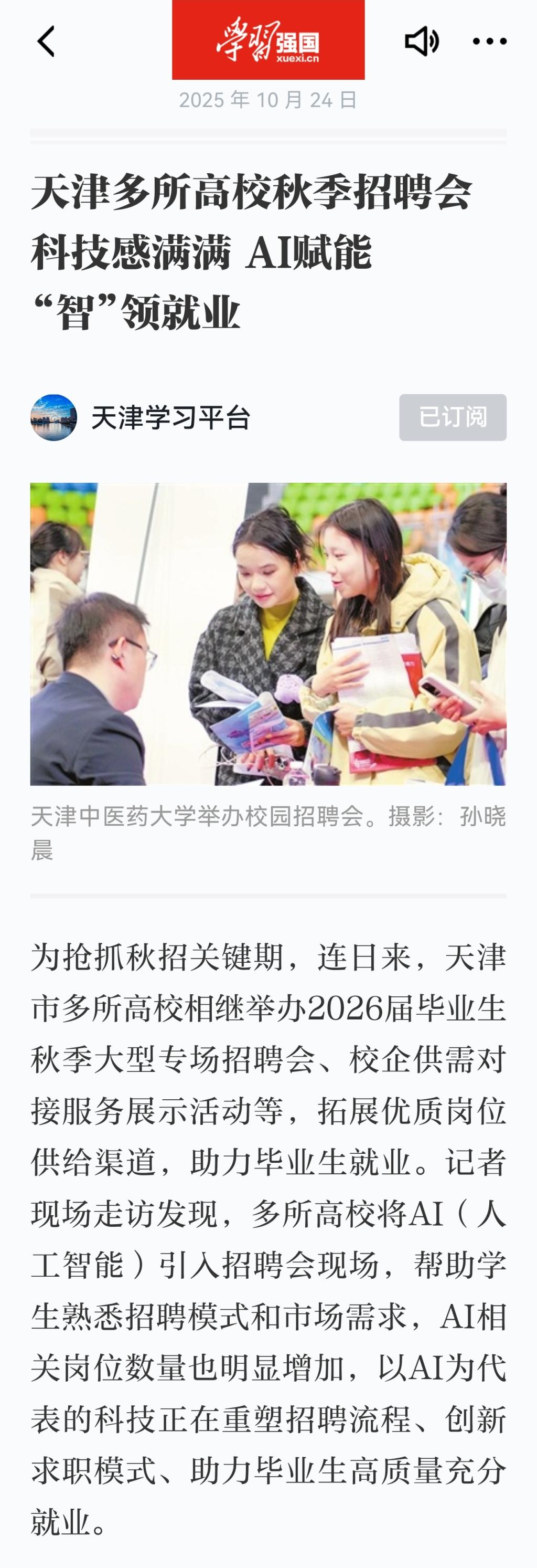 2025年10月24日,学习强国以《天津多所高校秋季招聘会科技感满满 AI赋能 “智”领就业》为题对我校进行了报道。