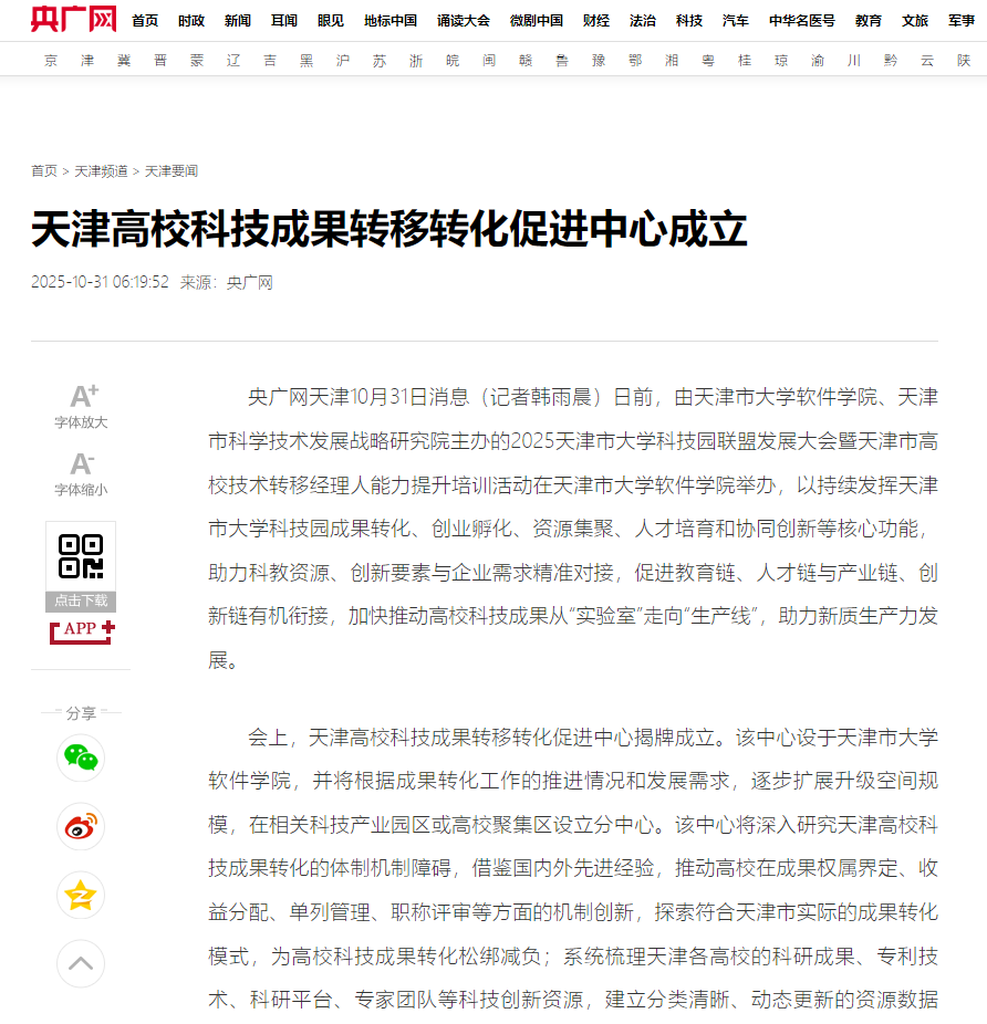 2025年10月31日,央广网以《天津高校科技成果转移转化促进中心成立》为题对我校进行了报道。
