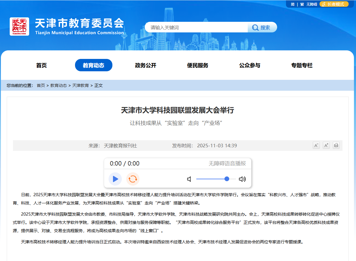 2025年11月3日,天津市教委官网以《天津市大学科技园联盟发展大会举行》为题对我校进行了报道。