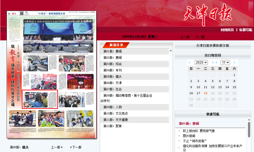 2025年11月18日,天津日报05版镜头以《天津 “十四五” 教育高质量发展掠影》为题对我校进行了报道。